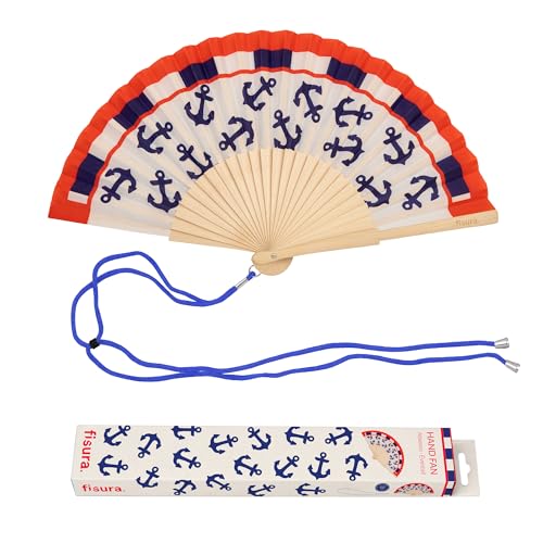 fisura. – Éventail en bois motif marin bleu et rouge, accessoire été à main avec dragonne incluse, design coloré pour plage, festival et vacances, idée cadeau femme original 42,5 x 23 cm