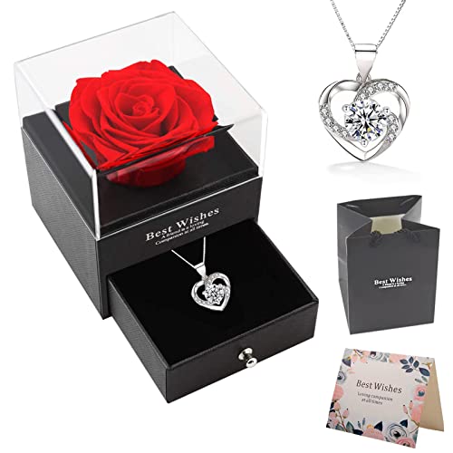 Rose Eternelle avec Bijoux,Rose Stabilisée Rouge,Conservée Préservés Vraie Cadeau Femme Anniversaire Saint Valentin Noël Fête des Mères Cadeaux pour sa Femme Maman Grand-Mère Copine