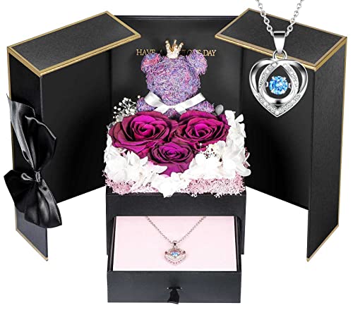 Cadeau Saint Valentin Femme, Rose Violette Eternelle avec Collier en Argent Sterling et Ours Rose, Cadeaux romantiques pour Saint Valentin,anniversaire:Parfait pour sa,copine,petite amie et maman