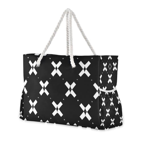 Grand sac fourre-tout à carreaux noirs et blancs pour femme avec poches latérales - Cadeau idéal pour le voyage, la plage, les anniversaires