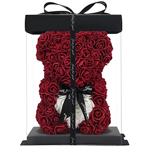 Ours en peluche en forme de rose Hugz de 25,4 cm – Plus de 250 douzaines de fleurs artificielles – Cadeaux uniques, cadeaux pour femme – Boîte cadeau transparente (rouge vin)