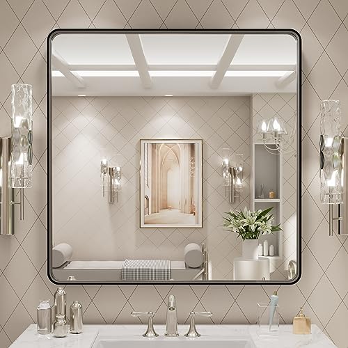 LOAAO 76,2 x 76,2 cm - Cadre en métal Noir Mat - Miroir de Salle de Bain - Grand Miroir Arrondi rectangulaire antirouille en Verre trempé à Suspendre