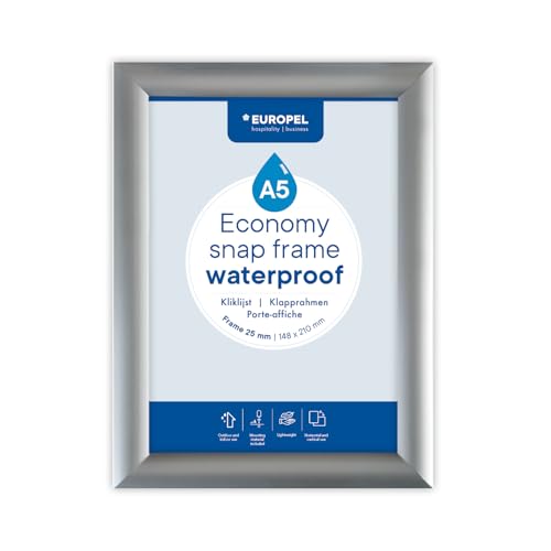 Europel Cadre clipsable Economy A5, étanche, couleur argent, Aluminium anodisé et film anti-reflets, Profil 25x11 mm, Cadre d'affichage pour posters de 14,8x21 cm, publicité, annonces, hôtel,