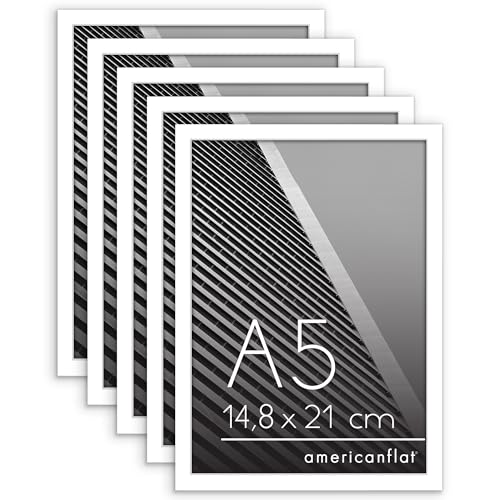 Americanflat Cadre Photo A5 Blanc - Cadre A5 avec Bordure Fine, Vitre Antichoc, Chevalet et Matériel de Suspension Intégré pour Mur et Surface Plane - Lot de 5