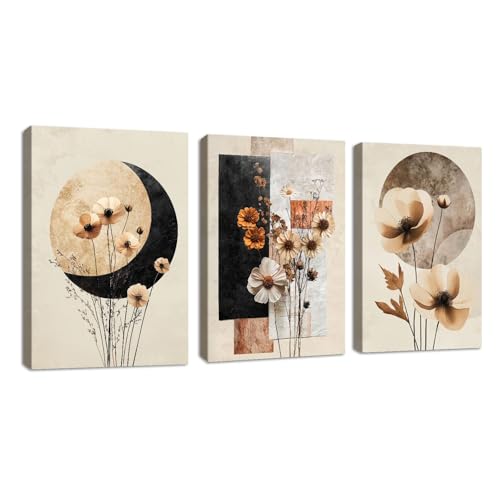 3 Pcs Beige Noir Géométrique Floral Impression Sur Toile Avec Cadre, Moderne Plantes Fleurs Tableau Decoration Murale Eucalyptus Feuille Affiche Peintures Decoration Chambre Maison Bureau 30x40cmx3