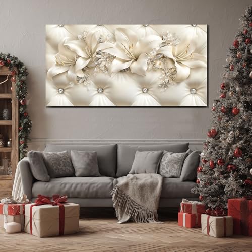 ZORYAN Chic Moderne Floraison Lys Cristal Tableau Decoration Murale Salon Grand Impression sur Toile Art Joyau Texture Cuir Blanc Cadre Mural Moderne Peinture pour Chambre Adulte Bureau 50x100 cm