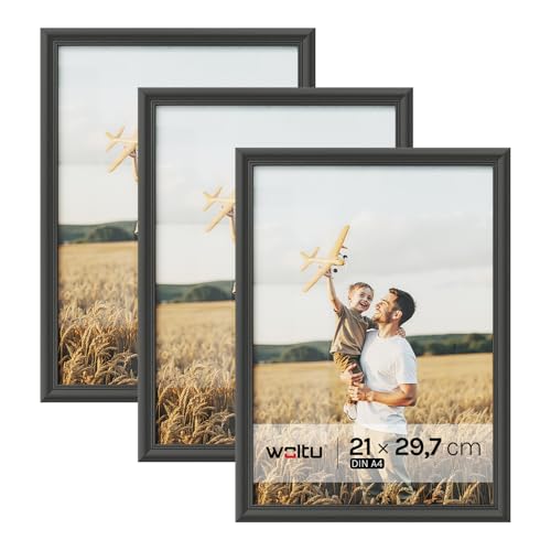 WOLTU Lot de 3 Cadre Photo A4 21,9x30cm Cadre en Bois Massif avec Passe Partout, Suspendre Horizontalement ou Verticalement, Décoration Murale ou sur Table, Noir