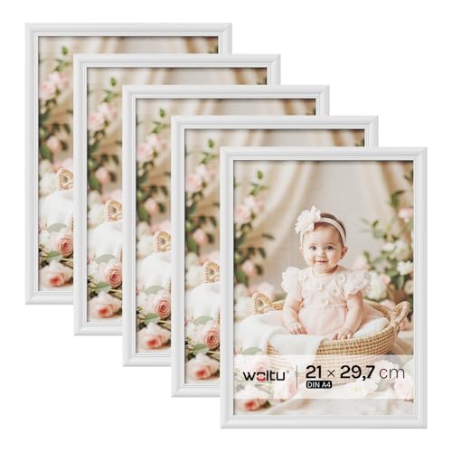 WOLTU Lot de 5 Cadre Photo A4 21,9x30cm Cadre en Bois Massif avec Passe Partout, Suspendre Horizontalement ou Verticalement, Décoration Murale ou sur Table, Blanc