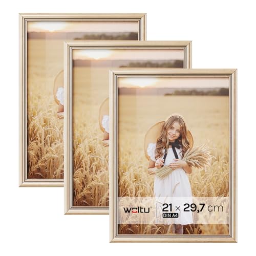 WOLTU Lot de 3 Cadre Photo A4 21,9x30cm Cadre en Bois Massif avec Passe Partout, Suspendre Horizontalement ou Verticalement, Décoration Murale ou sur Table, Or