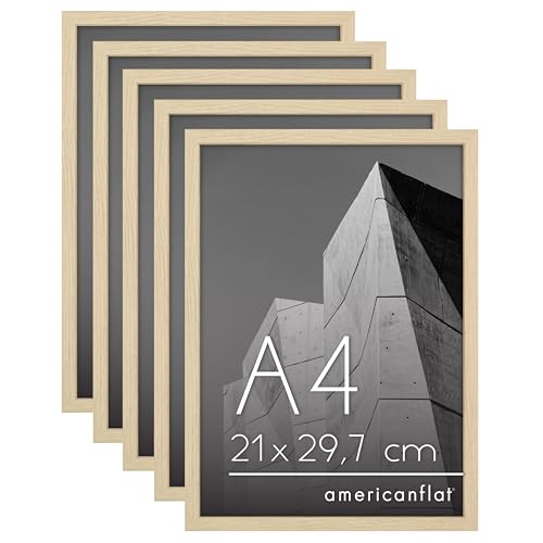 Americanflat Cadre Photo A4 Chêne Naturel - Cadre A4 avec Bordure Fine, Vitre Antichoc, Chevalet et Matériel de Suspension Intégré pour Mur et Surface Plane - Lot de 5