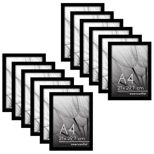 Americanflat Cadre Photo A4 Noir - Lot de 12 - Cadre A4 avec Plexi Poli et Chevalet Intégré - Bois MDF pour Exposition Murale Horizontale ou Verticale ou sur Table