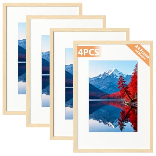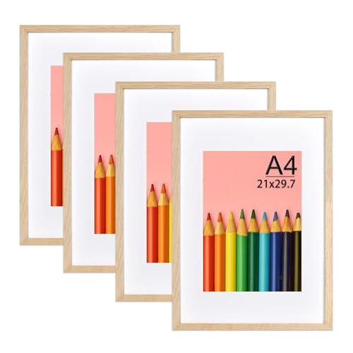 Alyvisun 4 Pcs A4 Cadre, Cadre Photo A4 Display Pictures 14x20 cm avec Passe-partout ou 19,7x29,3 cm sans Passe-partout, Cadre Photo Horizontal et Vertical pour Mur ou Table, Ton Bois