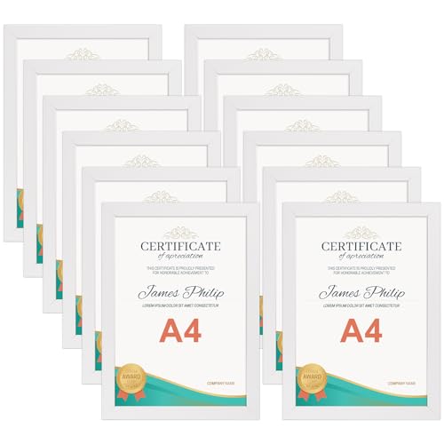 EXYGLO Cadre Photo A4 Blanc Lot de 12, Lot Cadre A4 pour Certificat Diplôme et Document pour Chambre, Bureau, Salon, Galerie et Cadeau - 21x29,7 cm