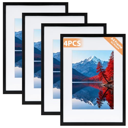 Alyvisun 4 Pcs A4 Cadre, Cadre Photo A4 pour Photos 14 x 20 cm avec Passe-Partout ou 19,7 x 29,3 cm sans Passe-Partout, Cadre Photo Horizontal et Vertical pour Mur ou Table, Noir