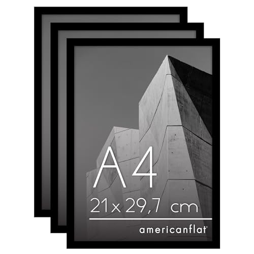 Americanflat Cadre Photo A4 Noir - Cadre A4 avec Bordure Fine, Vitre Antichoc, Chevalet et Matériel de Suspension Intégré pour Mur et Surface Plane - Lot de 3