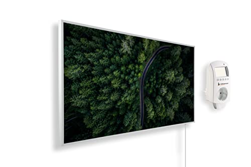 Könighaus Chauffage d’appoint infrarouge avec photo - 1200 W + Smart Thermostat connecté & appli Könighaus - Chauffage mural infrarouge économe avec motif - Cadre blanc (16. Route forestière)