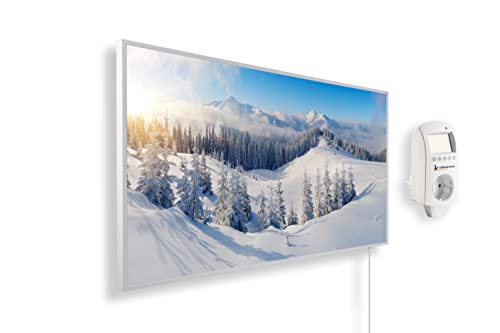 Könighaus Chauffage d’appoint infrarouge avec photo - 1000 W + Smart Thermostat connecté & appli Könighaus - Chauffage mural infrarouge économe avec motif - Cadre blanc (07. Paysage enneigé)