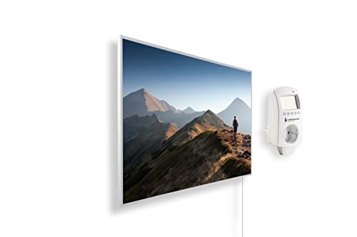 Könighaus Chauffage d’appoint infrarouge avec photo - 600 W + Smart Thermostat connecté & appli Könighaus - Chauffage mural infrarouge économe avec motif - Cadre blanc (02. Montagne et vallée)