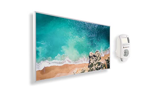 Könighaus Chauffage d’appoint infrarouge avec photo - 1000 W + Smart Thermostat connecté & appli Könighaus - Chauffage mural infrarouge économe avec motif - Cadre blanc (15. Plage de rêve 2)