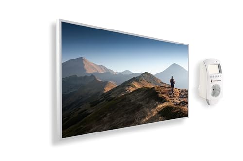 Könighaus Chauffage d’appoint infrarouge avec photo - 1200 W + Smart Thermostat connecté & appli Könighaus - Chauffage mural infrarouge économe avec motif - Cadre blanc (02. Montagne et vallée)