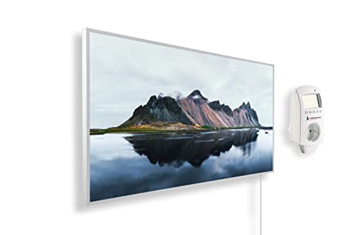 Könighaus Chauffage d’appoint infrarouge avec photo - 1000 W + Smart Thermostat connecté & appli Könighaus - Chauffage mural infrarouge économe avec motif - Cadre blanc (03. Montagne et lac)