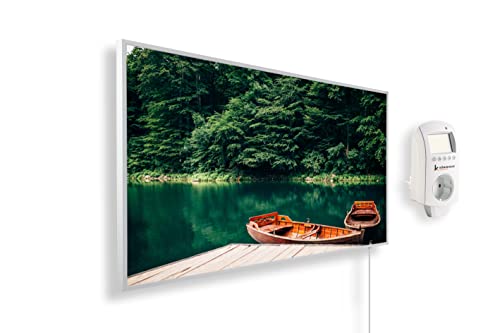 Könighaus Chauffage d’appoint infrarouge avec photo - 800 W + Smart Thermostat connecté & appli Könighaus - Chauffage mural infrarouge économe avec motif - Cadre blanc (04. Bateau et lac)