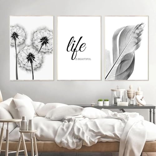 YLHKME Minimaliste Tableau Pissenlit Plume Noir et Blanc Amour,Affiche Toile Tableau Decoration Murale Salon,pour Chambre Cuisine Bureau, Deco Maison, sans Cadre (B-Frameless,3X30X40CM)