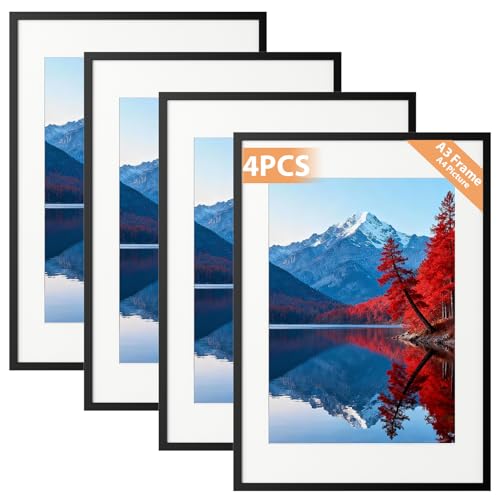Alyvisun 4 Pcs A3 Cadre, Cadre Photo A3 pour Photos 20.5 x 28.7 cm avec Passe-Partout ou 28.7 x 41 cm sans Passe-Partout, Cadre Photo Horizontal et Vertical pour Mur ou Table, Noir