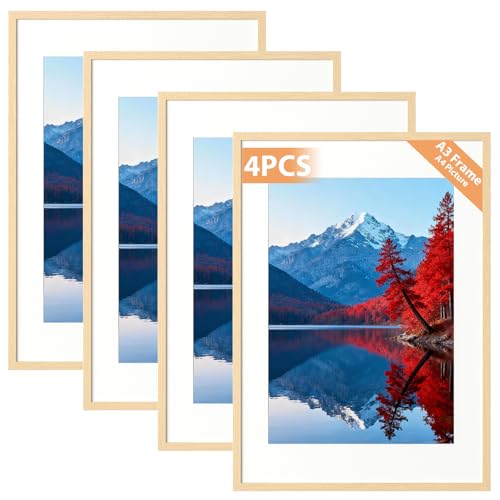 Alyvisun 4 Pcs A3 Cadre, Cadre Photo A3 pour Photos 20.5 x 28.7 cm avec Passe-Partout ou 28.7 x 41 cm sans Passe-Partout, Cadre Photo Horizontal et Vertical pour Mur ou Table, Ton Bois