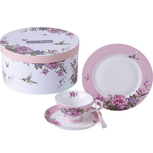 London Boutique Lot de 3 Tasses à café et Soucoupe 19,1 cm - en Porcelaine Vintage Chic - Oiseau Papillon Floral - Coffret Cadeau (Rose)