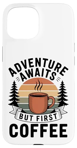 Adventure Awaits Cafetière Lover Randonnée Camping en Plein air Coque pour iPhone 15