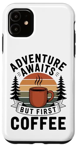 Adventure Awaits Cafetière Lover Randonnée Camping en Plein air Coque pour iPhone 11