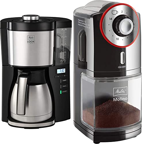 Melitta Look Therm Timer 1025-17 Cafetière filtres 1X4 Fonction arrêt Automatique 10 Tasses Noir/Acier Brossé, 1080 W, 1.25 liters & Molino, Noir/Rouge, Moulin à Café Électrique, Broyeur à Meule Plate