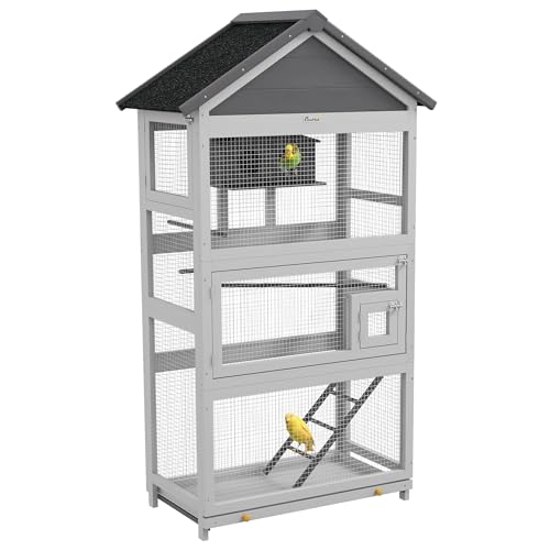 PawHut Cage à Oiseaux en Bois, Cage Perroquet, Aire de Jeux, volière Oiseaux extérieur, Toit Asphalte imperméable, pour Perruche, calopsitte, Conure, canaris, 92 x 52 x 171 cm, Gris