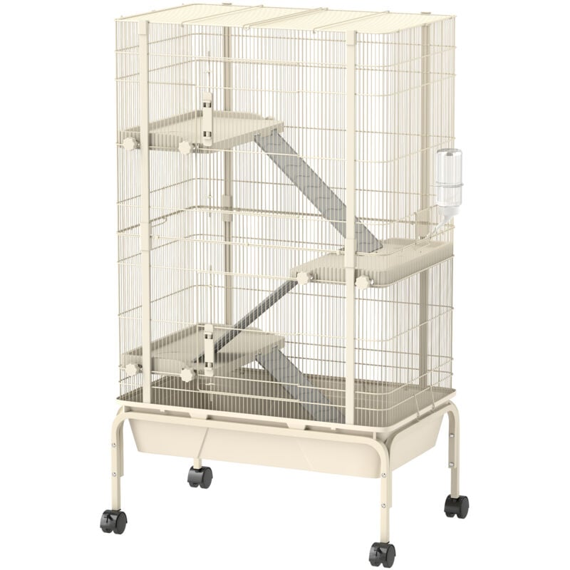 PawHut Grande Cage enclos Lapin à 4 Niveaux, Parc Lapin pour furets et Chinchillas avec 2 Portes, 3 rampes, Plateau Profond de 15 cm, roulettes, Bouteille d'eau, gamelle, 69 x 44 x 120 cm, Beige