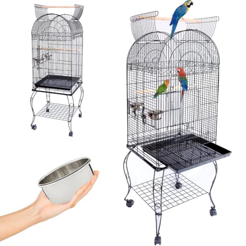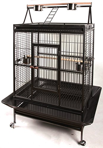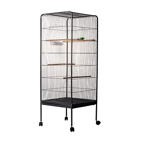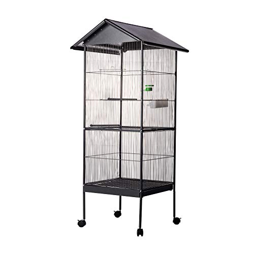 BAKAJI Cage volière pour Oiseaux, perroquets inséparables, perruches, Oiseaux avec Chariot et Toit ouvrant en métal et Bois Noir Cage avec perroquets et Roues avec Bloc, 59 x 59 x 150 cm
