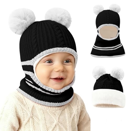 JFAN 2 en 1 Bonnet Bebe Fille Garcon Cagoule Enfant Chaud Chapeau Hiver Bebe Doublé en Polaire Laine Multicolore Beanie Noir