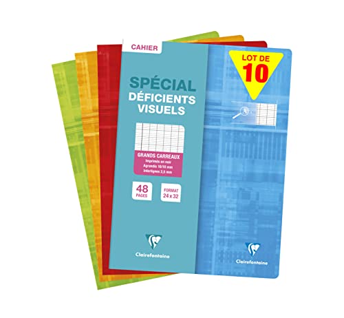 Clairefontaine 63196C Lot de 10 Cahiers Agrafés Déficients Visuels - 24x32 cm - 48 Pages Grands Carreaux Noirs 2,5 mm Agrandis - Papier Blanc 90 g - Couverture Carte Pelliculée - Couleurs Aléatoires