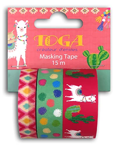 DRAEGER PARIS 1886 Toga by Masking Tape Oh Lama - Assortiment 3 Rouleaux Décoratifs Multicolores - Thème Lamas, Cactus, Ikat - Dimensions: 1cm/1.5cm/2cm x 5m - Cahiers, Agendas, Projets Créatifs