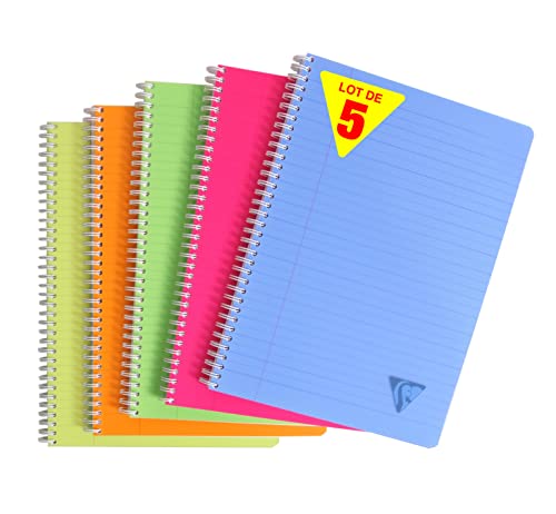 Clairefontaine 328146C Collection Linicolor Fresh Lot de 5 Cahiers à Spirale - A4 21x29,7 cm - 180 Pages Lignées avec Marge - Papier Blanc 90g - Couverture Polypro Transparent - Couleurs Aléatoires