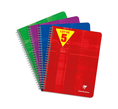 Clairefontaine 68761C Lot de 5 Cahiers à Spirale - 17x22 cm - 180 Pages Grands Carreaux - Papier Blanc 90 g - Couverture Carte Pelliculée - Couleurs Aléatoires