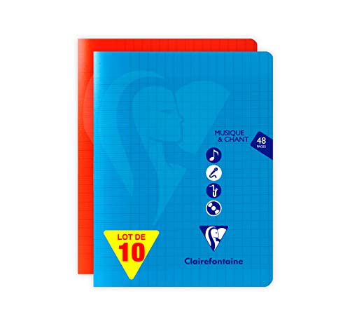 Clairefontaine 303797C Lot de 10 Cahiers Agrafés Musique & Chant - 17x22 cm - 48 Pages Grands Carreaux et Portées avec Lignes - Papier Blanc 90 g - Couverture Polypro Transparent - Couleurs Aléatoires