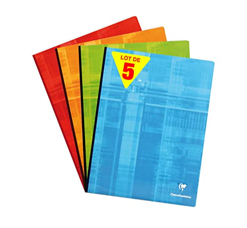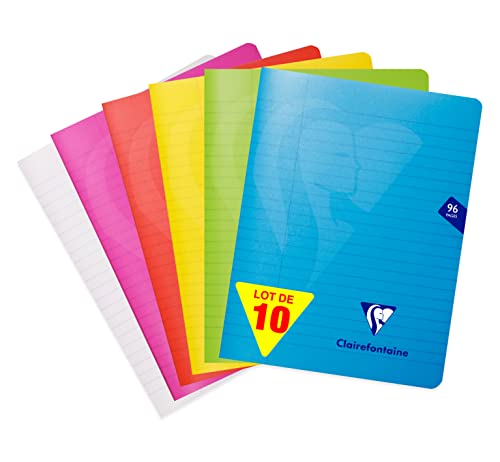 Clairefontaine 63365C Lot de 10 Cahiers Agrafés - 24x32 cm - 96 Pages Lignées avec Marge - Papier Blanc 90 g - Couverture Carte Pelliculée - Couleurs Aléatoires
