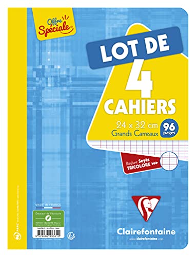 Clairefontaine 643361C Lot de 4 Cahiers Agrafés - 24x32 cm - 96 Pages Grands Carreaux - Papier Blanc 90 g - Couverture Carte Pelliculée Couleurs Aléatoires
