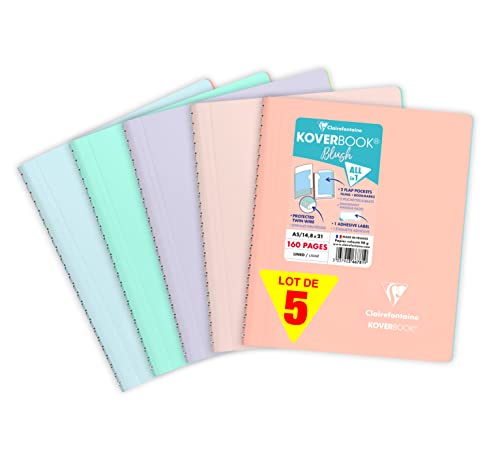 Clairefontaine 366781C Lot de 5 Cahiers à Spirale Koverbook Blush - A5 14,8x21 cm - 160 Pages Lignées - Papier Blanc 90 g - Couverture Enveloppante Polypro Opaque - Couleurs Aléatoires