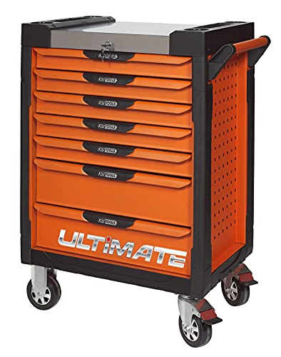 KS TOOLS - 819.0007 - Servante d'atelier Vide Ultimate 7 tiroirs - Caisse à Outil - Couleur Orange- Plateau INOX - Porte flacons