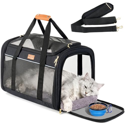 Morpilot Sac Transport Chat, Sac Transport Chien Respirant et Pliable, Caisse de Transport Chat avec Bandoulière Réglable, Cage Transport Chat avec Matelas en Peluche Amovible+Bol