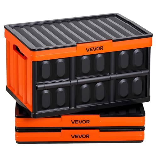 VEVOR Caisse Plastique Pliable avec Couvercle 45 L, Lot de 3, Bac de Rangement Pliable et Empilable avec Poignées, Charge Max. 20 kg par Caisse pour Maison, Camping, Voiture et Courses, Noir et Orange