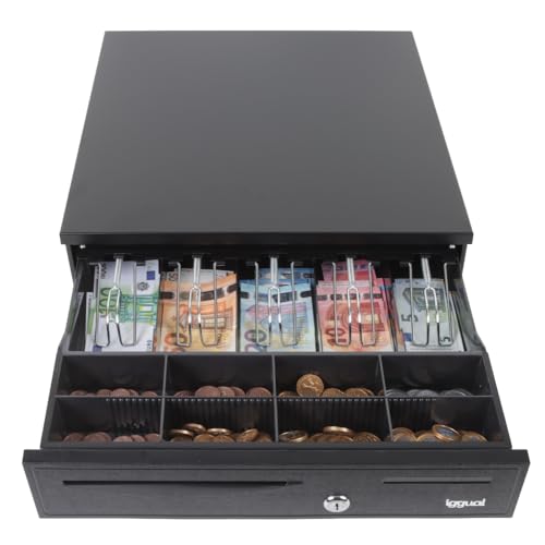 iggual - Tiroir Caisse pour Caisse Enregistreuse à Ouverture Manuelle ou Automatique, Noir, 5 Compartiments pour Billets et 5 pour Pièces, Serrure à 3 Positions, Modèle Iron - 30