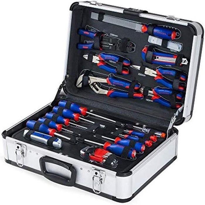 HANGER Caisse à outils complète pour le quotidien, 121 pièces, Pinces et coupe-tout, Scie, tournevis et Clés mixtes, Outillages à main, Douilles et accessoires en 1/4", 1/2" - Multiples embouts